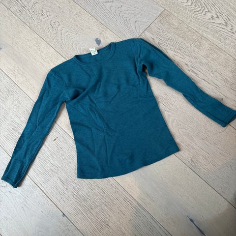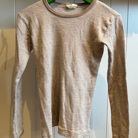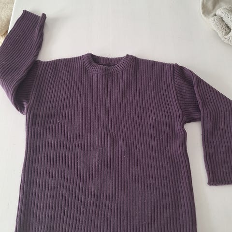 Pent brukt av ett barn trøye. Ikke tovet/ krympet, noen skyggeflekker/ misfarging som er lett å fjerne med sitronsåpe. Rillestrikk i ull/ silke, Small modell.