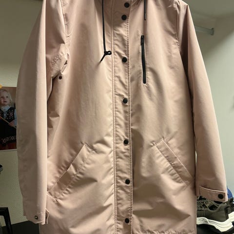 Jakken har hette, glidelås og trykknapper foran, samt snøring i midjen for bedre passform.