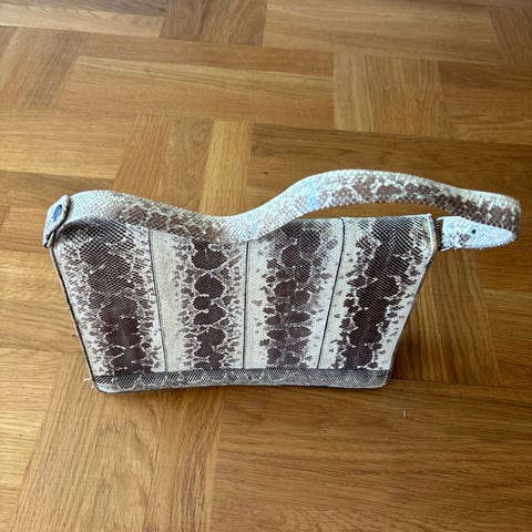 Gammel veske, fra ca 60 tallet, i ekte slangeskinn til salgs. Flere rom innvendig.