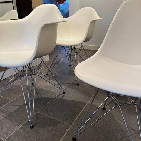 Selger 3 brukte stoler fra Vitra / Ray Eames. Stolene er plastic, hvite stoler med sorte stolben. Stolene er brukt med normale bruksmerker. Selges enkeltvis eller samlet. 1300 pr. stk.
