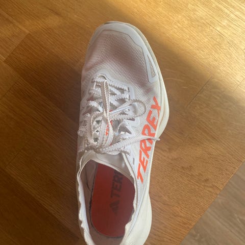 Adidas Terrex Agravic Speed Ultra Trail løpesko for kvinner i størrelse 38. Skoene har en kombinasjon av hvit, oransje og dash grey farger. Designet for terrengløping med slitesterk yttersåle og lett materiale.
