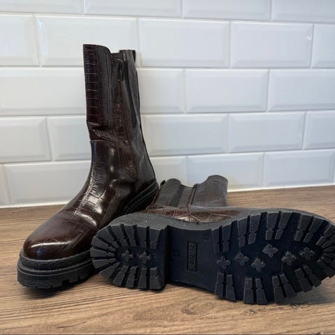 Behagelig modell, skinnforet. Glidelåslukking på siden med trykknapp øverst. Hælhøyde 3cm. Litt høyere foran på støvelskaftet. Høyde foran på støvlen 45 cm . Behagelig, klassisk og fin støvlett. Kun brukt et par ganger.