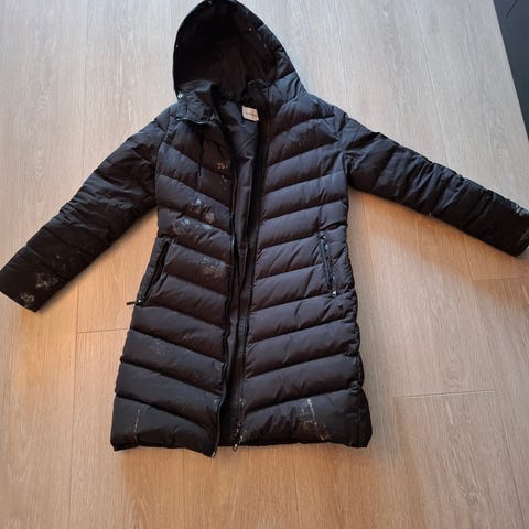 Cubus Lang Vinterjakke i svart farge, størrelse L Jakken har hette, glidelås og knapper foran, samt lommer på front.