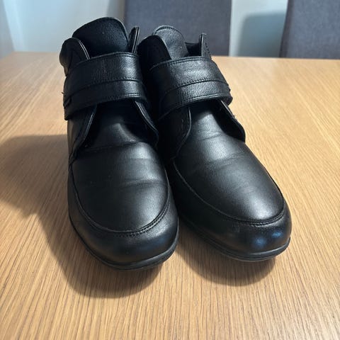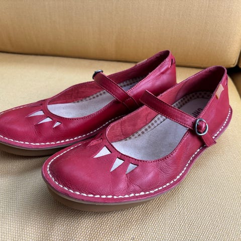 Slip on clogs av naturgarvet lær med såle av naturgummi. Plommerød/ mørkerød. Lenge siden jeg kjøpte dem, men har aldri tatt dem i bruk. Er for fine til å bare ligge i et skap. Str 39.