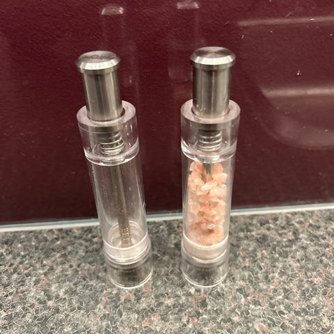 Menu bottlegrinder, https://royaldesign.no/bottle-grinder-krydderkvern-2-pk?p=198399&utm_source=google&utm_medium=cpc&utm_campaign=08:+RDNO_+Pmax_All&gclsrc=aw.ds&gad_source=1&gad_campaignid=22747648973&gbraid=0AAAAADtR2XsadjmovTkGnnNrQ3F2jGjNH&gclid=Cj0KCQjw9JLHBhC-ARIsAK4Phcp-s0ppjUz_TjwNodJopBgNgTTspKpmegPdfoqBYyAXZlN-CP798IIaAmYBEALw_wcB lik disse selges. Ikke vært brukt, men stått fremme til pynt. De har ett litt klissete belegg utenpå, tror det fint kan vaskes bort (har stått på hylle langt unna komfyr, så er nok bare litt støv som har satt seg i det matte belegget. Aldri hatt salt og pepper oppi.