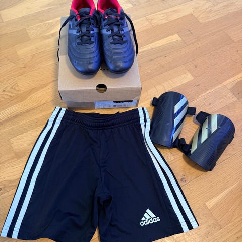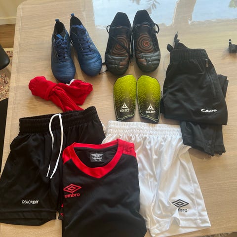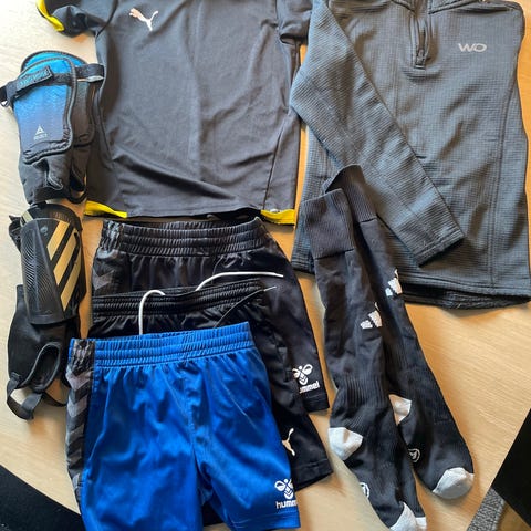 Tre shorts og en trøye, samt leggskinn og sokker.
