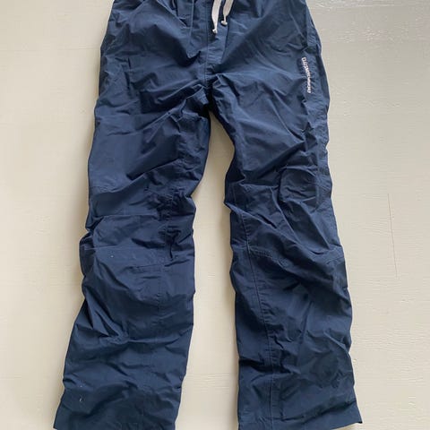 Pent brukt masse bruk igjen. Didrikson shell bukse str 130 som tilsvarer 7-8 år. Buksen har strikk og knyting i livet, feste på innsiden til å henge opp (praktisk til knagg på skolen) og borrelås stramming på bena med reflex. Det står navn på lappen på innsiden, men det kan alltids rables/festes ny over.