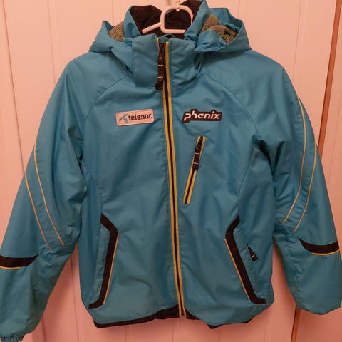 Jakke fra Phenix str. 12 år. To lommer med glidelås foran, en lomme med glidelås på brystet og en innerlomme med glidelås. Borrelås på ermene. 100 % polyester.