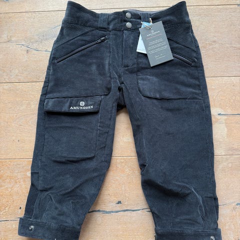 Klassisk mørk blå Amundsen Knickers for menn i størrelse S. Laget av kordfløyel materiale. Designet for komfort og holdbarhet med flere lommer og knappelukking.