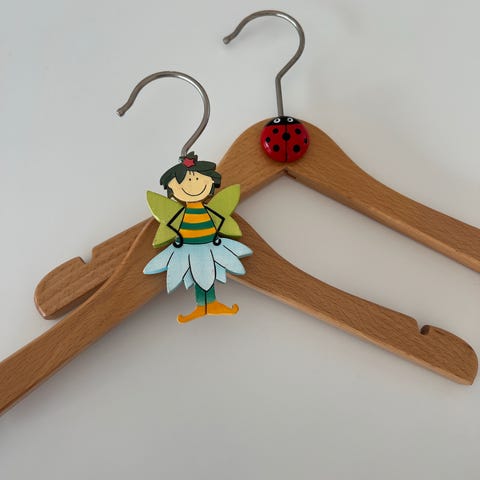 Retro kleshenger for barn eller dukkeklær / barnehenger i malt tre. Svært pent brukt og i god stand. Selges kr. 100,-. Hentes Lillehammer. Kan også sendes mot at kjøper dekker porto.