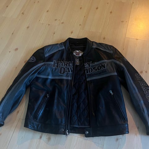 Harley-Davidson Skinnjakke i svart farge for herre. Laget av skinnmateriale med glidelåslommer og justerbare stropper på sidene. Jakken har brodert logo og detaljering på både for- og bakside.