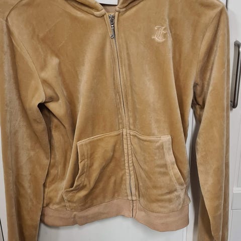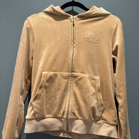 Myk og behagelig velour hettejakke fra Juicy Couture i str. 10-11 år. Jakken har Juicy Couture-logoen i gull på brystet og på ryggen. Hettejakken lukkes med glidelås på fremsiden. Farge: Croissant. Hettejakken er pent brukt.