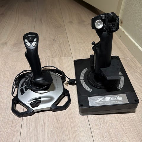 Saitek X52 Pro Flight Stick for PC. Inkluderer joystick med flere knapper og justerbar gasskontroll. Begge enheter har USB-tilkobling og sugekopper under for stabil plassering på skrivebord.