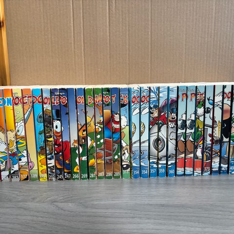 Disney Donald Duck tegneserier samling med forskjellige bind. Inneholder flere fargerike omslag med klassiske Donald Duck-figurer. Passer for samlere og lesere av Disney-tegneserier.