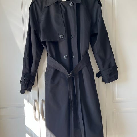 Vero Moda trenchcoat i svart farge, størrelse L. Plagget er designet for kvinner og har et klassisk snitt med belte i midjen. Jakken har doble knapper foran og detaljer på skuldrene.