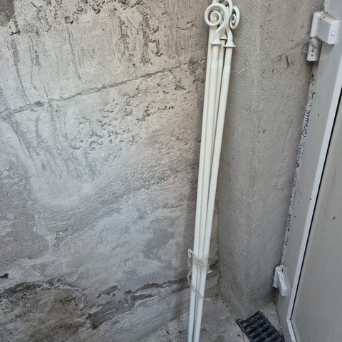 Selger flere gardinstenger i ulike lengder og farger (hvite og sølv).