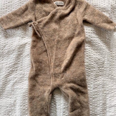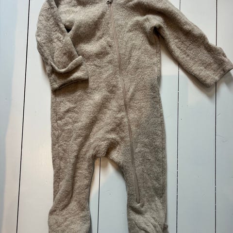 Overall merinoull fra Cubus i størrelse 86, unisex. Fargen er beige, og materialet ser ut til å være mykt og varmt, egnet for barn.