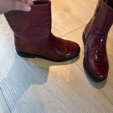 H&M Jente Støvler i størrelse 26, laget av rødt kunstlær med mønster som etterligner krokodilleskinn. Støvlene har en svart såle og er designet for barn.