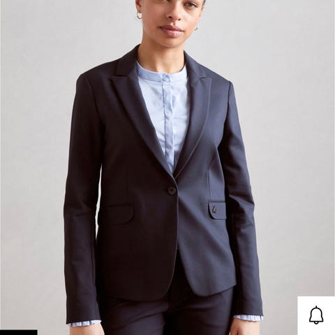 Blazeren har en klassisk passform med to frontlommer og en knappelukking. Materialet består av 52% polyester, 43% viskose og 5% elastan, som gir litt stretch og komfort.