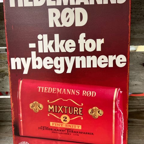 Skilt I Tynnmetall(reprodusert) 20X30. Med bilde av: Tiedemann’s rød, ikke fôr nybegynnere . Hentes eller sendes mot porto kr 65,- m/sporing eller med Fix ferdig. Ønsker du og kjøpe flere varer på en frakt, ta kontakt før du kjøper. Ønsker du og reservere, vipses halve summen på forhånd. For og se mine andre annonser, trykk på profilbilde og så annonser. NB! ER PÅ JOBB MAN - FRE MELLOM 06:30 - 16:00. NOEN GANGER MÅ JEG VENTE TIL ETTER JOBB MED OG SVARE. mvh Carsten