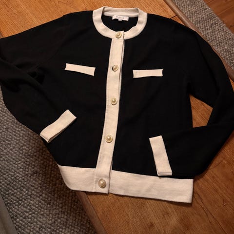 Floyd Cardigan i hvit farge, størrelse L. Laget i et teksturert materiale med knapper foran og to brystlommer med knappelukking. Designet for kvinner.