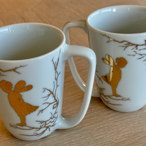 Selger 2 krus med fuglemotiv, gullkant og teksten «Alle fugler små de er». Diameter 6 cm, høyde 9 cm, altså litt mindre enn vanlige krus.