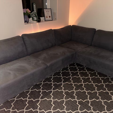 Mørk blå velur sofa som er godt, men pent brukt. Ikke mye synlige merker. Den er bred og god, så funker også utmerket som en sovesofa. Kan skrues fra hverandre i to deler.