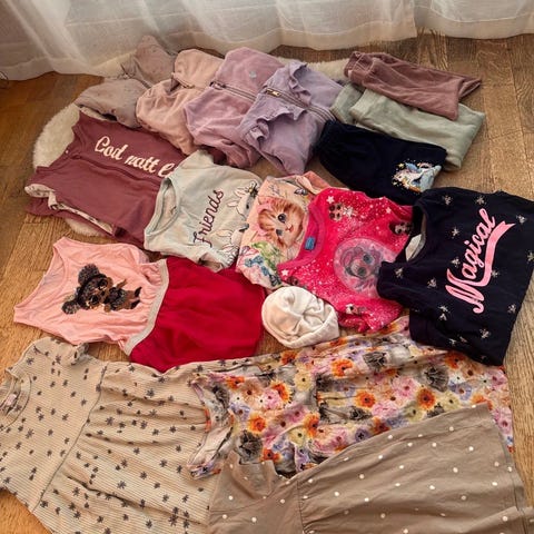 Klærne er brukt av jenta vår og er i ulike størrelser. Noen plagg har små flekker som ikke går helt bort, men de er fortsatt fine å bruke – disse selges rimeligere. Det er også mange klær i god kvalitet, samt noen dyrere merker som fortsatt ser veldig pene ut og derfor selges til en litt høyere pris.