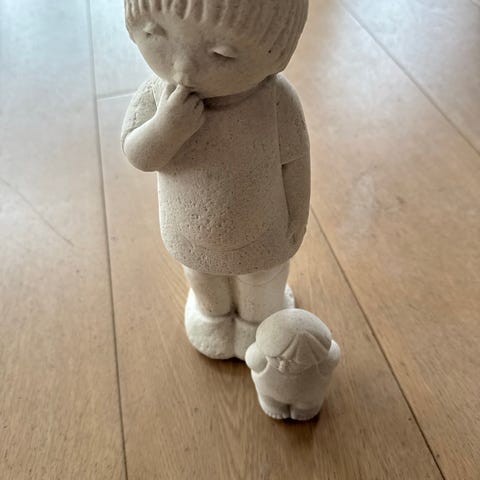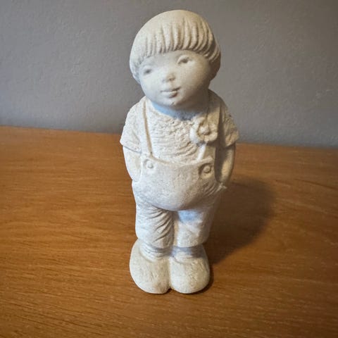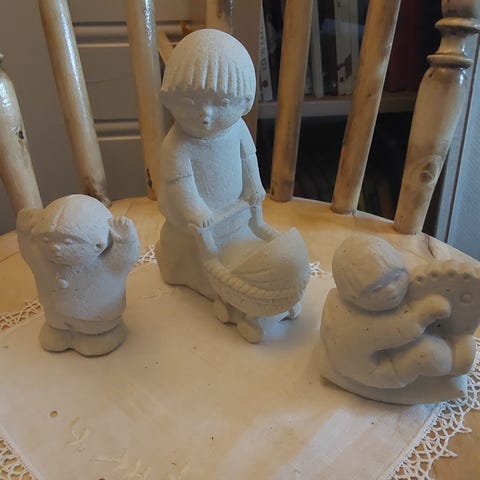Sett med dekorative figurer laget av hvit keramikk. Figuren inkluderer to barn på sparkesykkel og to andre figurer med ulike positurer. Passer til innendørs dekorasjon.