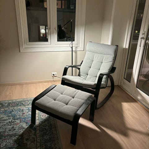 Godt brukt, men har stått i fred på et babyrom utenom bruk. Vi har forsøkt å vaske trekket, men da løsnet det litt i sømmen på et sted (se bilde). Ramma er fortsatt hel og pen, og det er tilgjengelig mange forskjellige trekk til både stol og fotskammel på IKEA om man ønsker å bytte ut dette.