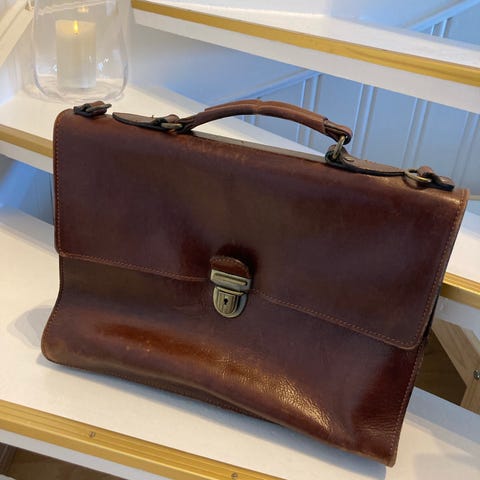 Pen skinnveske med patina selges. Hel og fin, med unntak av et par huller i skinntrekket på håndtaket - det bør være enkelt å fikse enten selv eller hos en lærskredder/skomaker.