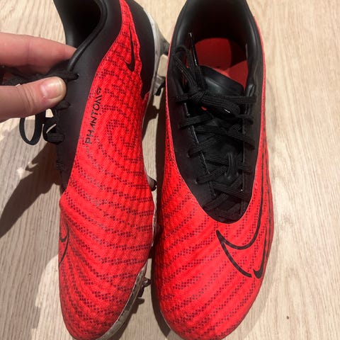 Nike fotballsko i størrelse 42,5 (EU), svart med røde detaljer. Skoene har knotter under sålen for bruk på gressbaner. Materialet er syntetisk med snøring foran. Skoene viser tegn på bruk, inkludert slitasje og hull på undersiden av sålen.