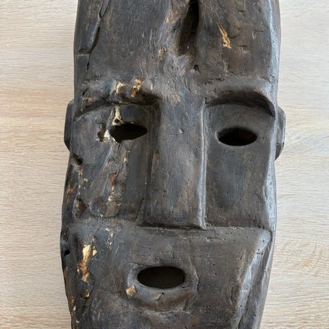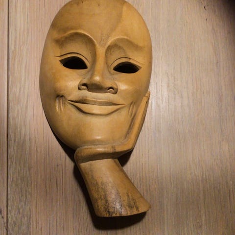 To dekorative masker laget av tre med utskårne ansiktsuttrykk som viser henholdsvis glede og sorg. Maskene har snorer for oppheng og kan brukes som veggdekorasjon.. husker dessverre ikke hvor de er kjøpt. De har høyde 32 og 18cm bredde