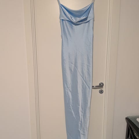 Festkjole i lilla farge, størrelse S. Kjolen har en v-formet utringning, dekorative stoffroser ved midjen og knappedetaljer bak. Materialet er av satin.
