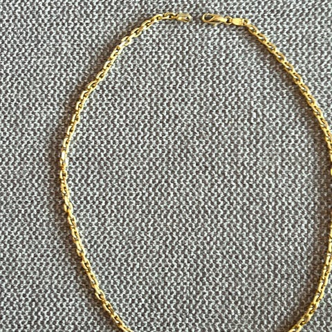 Kjede i gult gull (14 karat) med bredde 2,7 mm - 5 mm. Kjede har panser mønster og passer perfekt alene, eller i lag med andre kjeder. Lengde 43,5 cm.