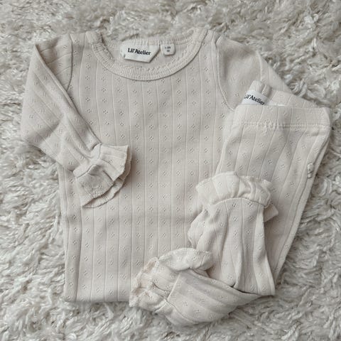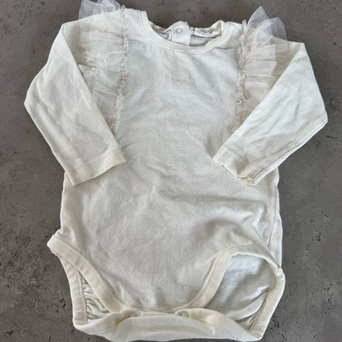 Newbie Body for jenter i størrelse 68. Bodien er hvit med lange ermer og har detaljer i blonder på skuldrene. Laget av mykt materiale