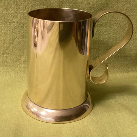 Krus i sandstøpt messing, h 14 cm, diameter 8 cm.