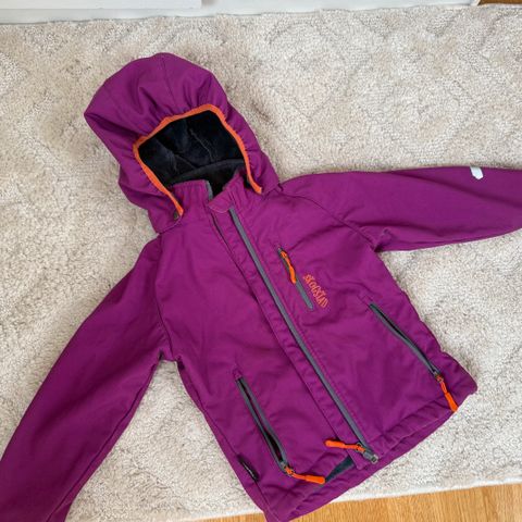 Skogstad barnejakke i blå farge, størrelse 110, designet for unisex bruk. Jakken har hette, glidelås foran med rosa detaljer, og reflekser på ermene for økt synlighet. Materialet er quiltet for varme og komfort.