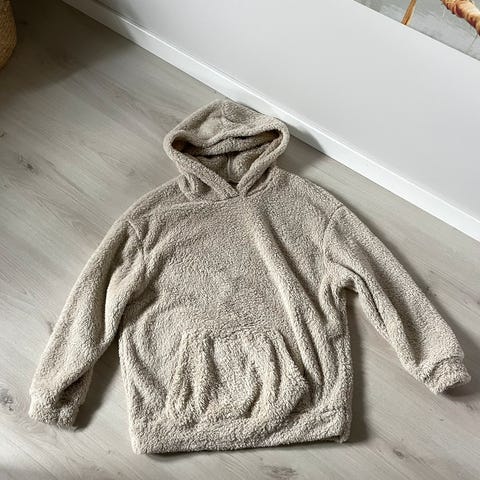Selger en pent brukt teddy-fleecejakke i størrelse XS. Fargen er hvit/lysegrå ✨ Selges til 100 kr!