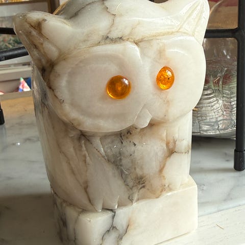 Flott liten håndlaget steinskulptur i form av en fugl. Figuren er laget av hvit stein med noen naturlige fargedetaljer. Passer som dekorasjon eller samlerobjekt.