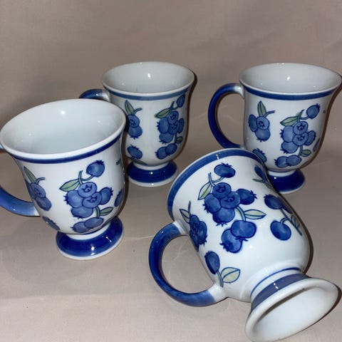Stilige kaffekopper med blå blomstermotiv. Kopperne er i porselen med dekorative blå blomster og har en fotet design. Passer til servering av kaffe eller andre varme drikker.