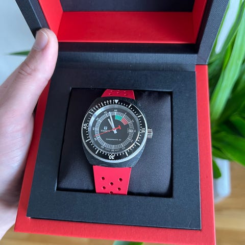 New Old Stock Camy klokke med dag, dato og hvilken dag-i-uken visning på skiven. Meget stilfull med original Camy lenke. Kommer med tidsriktig boks.