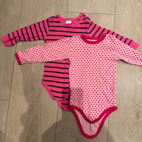 H&M Body for jente i størrelse 86. En rød og en rosa. Begge med nydelig krage og trykknapper i rygg og nede. Rosa body har et hull nede som kan sees på bilde 1. ellers hele, pene og søte.
