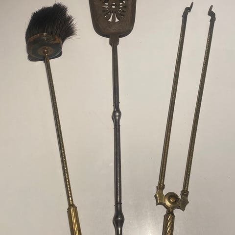 I følge søk med google lense: «et gammel peissett i messing, ofte kalt peisverktøy eller peisjern. Slike sett ble vanligvis brukt til å håndtere ved og glør i en åpen peis. Disse spesifikke peisjernene ser ut til å være i viktoriansk stil, preget av et dekorativt og utsmykket design.