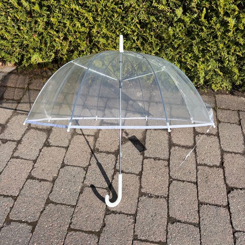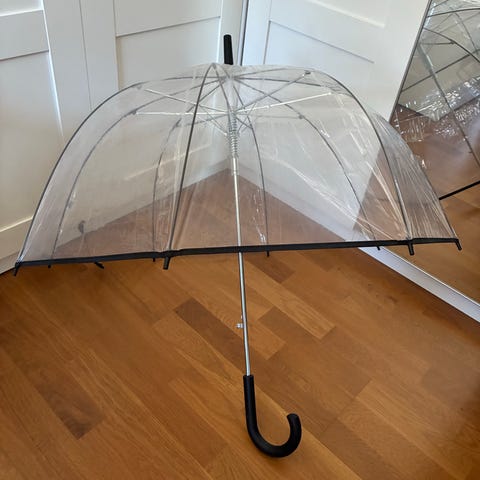 Helt ny, ubrukt gjennomsiktig paraply, med merkelapp.