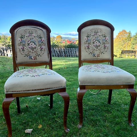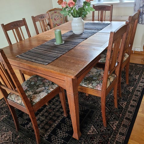 Sett med Rokokko spisestuemøbler bestående av et ovalt bord i tre og seks polstrede stoler. Stolene har ulikt trekkstoff, med noen i mønstret stoff i røde toner og andre med blomstrete sete. Bordet og stolene har utskårne detaljer og viser tegn på slitasje og alder.