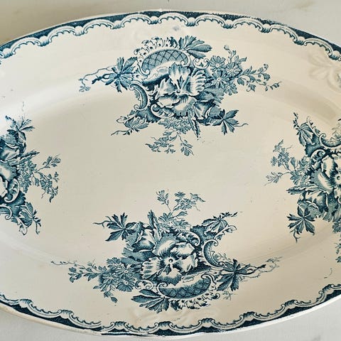 Vakkert ovalt serveringsfat fra Egersunds Fayancefabrik, laget på 1930–50-tallet.