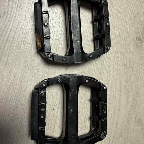 Sykkelpedaler i metall med innebygde oransje refleksstriper for økt synlighet. Pedalene har standard gjenger for enkel montering på de fleste sykler. Passer for både by- og terrengsykler.