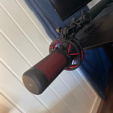 HyperX QuadCast mikrofon med RGB LED-belysning i svart farge. Mikrofonen har en innebygd støtdemper og et stativ for bordmontering. Designet for streaming, gaming og opptak med klar lydkvalitet.