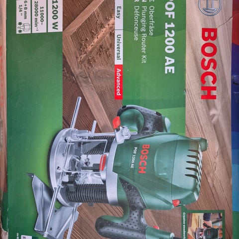 Bosch POF 1200 AE overfreser med en effekt på 1200 watt. Maskinen har variabel hastighet fra 11000 til 28000 o/min. Leveres med flere fresebits og tilbehør for ulike fresingoppgaver. Egnet for presisjonsarbeid i tre og andre materialer.